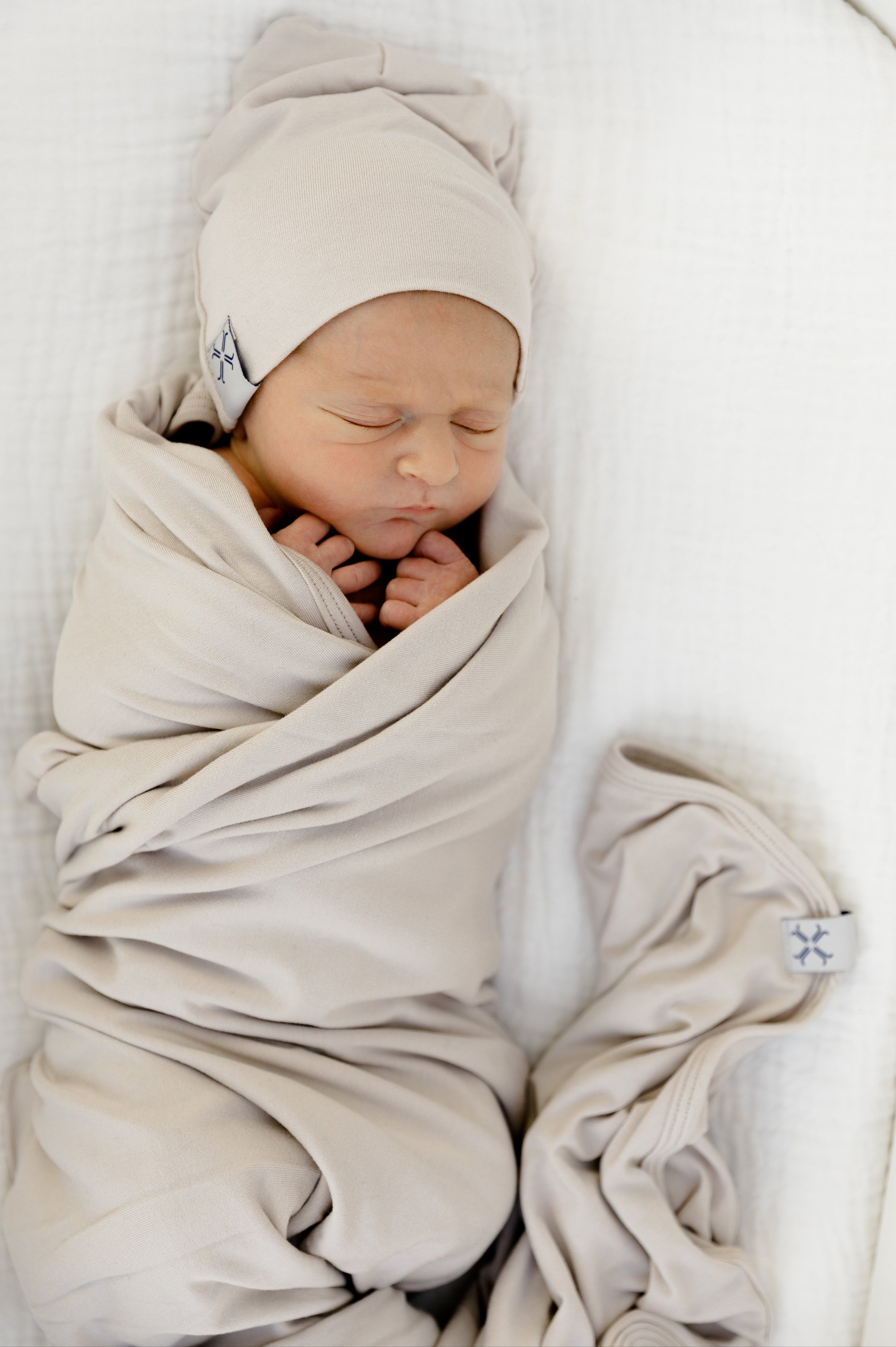 The popular Jacqueline & Jac beanie & blanket gift set includes a large blanket with a matching Jacqueline & Jac beanie. The blanket is super soft with ample amount of stretch. It includes a direction card for your baby to be perfectly swaddled in their new set. The matching duo comes in a gift box, and is perfect for leaving the hospital comfortably and in style.