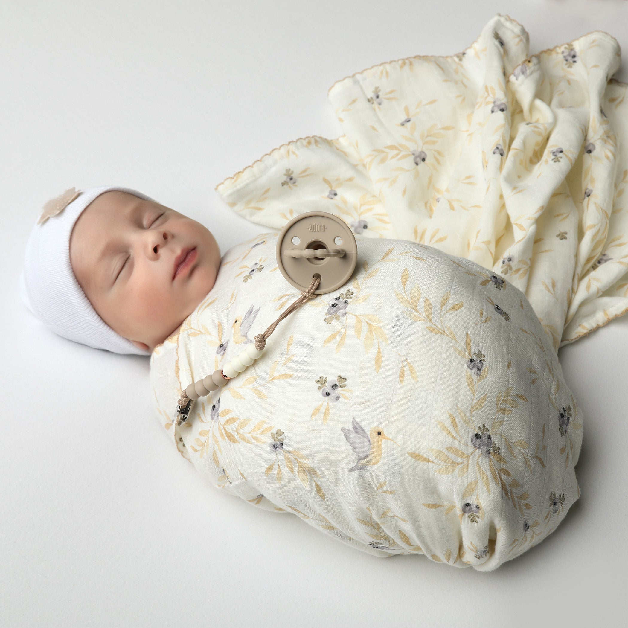 Swaddle measures 45″ X 45″ (114cm X 114cm)