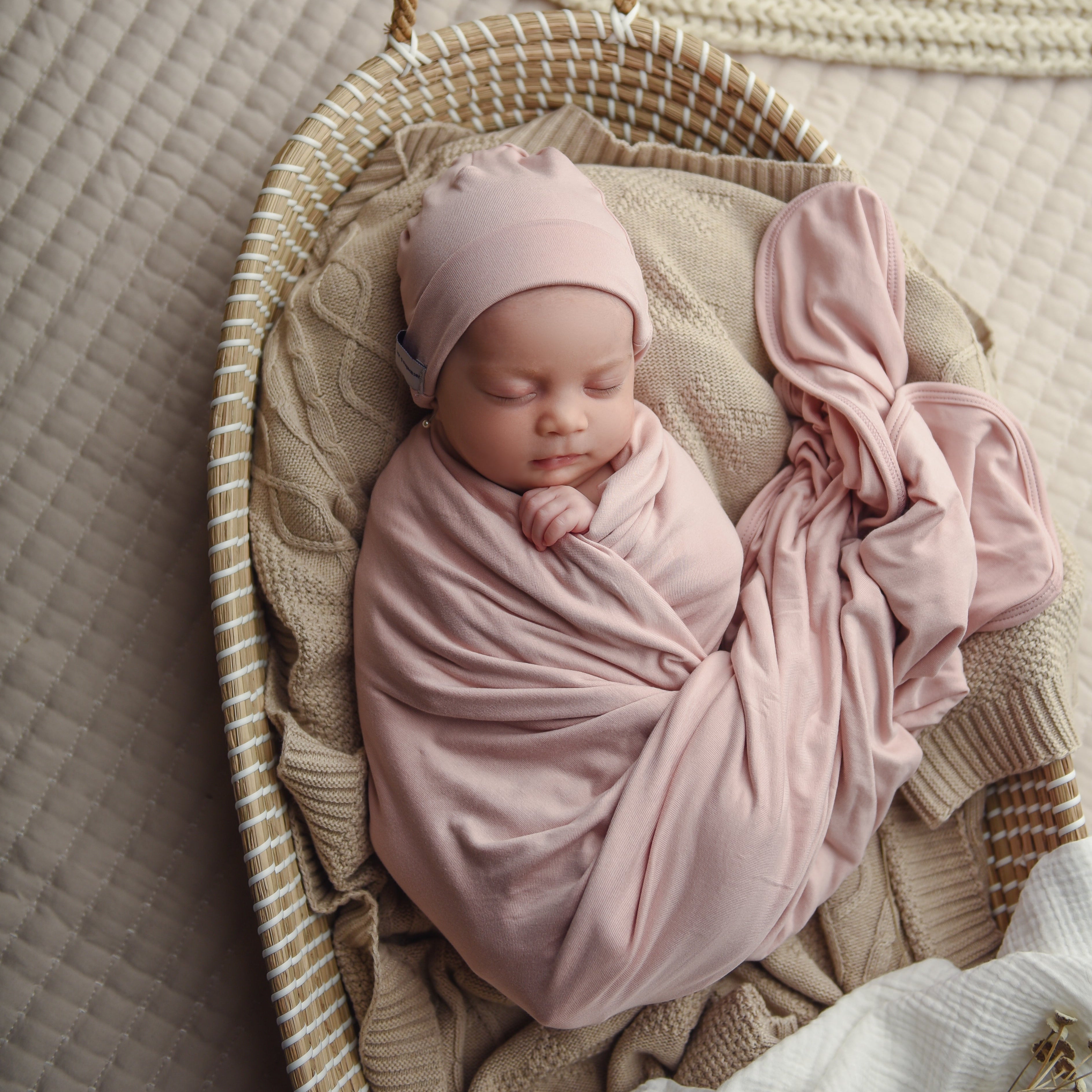 The popular Jacqueline & Jac beanie & blanket gift set includes a large blanket with a matching Jacqueline & Jac beanie. The blanket is super soft with ample amount of stretch. It includes a direction card for your baby to be perfectly swaddled in their new set. The matching duo comes in a gift box, and is perfect for leaving the hospital comfortably and in style.